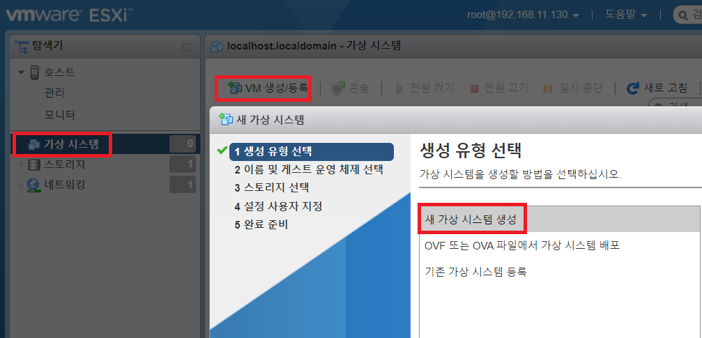 우선 웹으로 ESXI에 접속한 후 가상머신을 설치하기 위해서 다음과 같이 수행하자