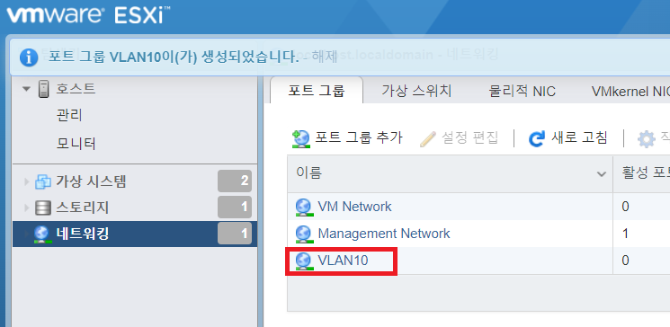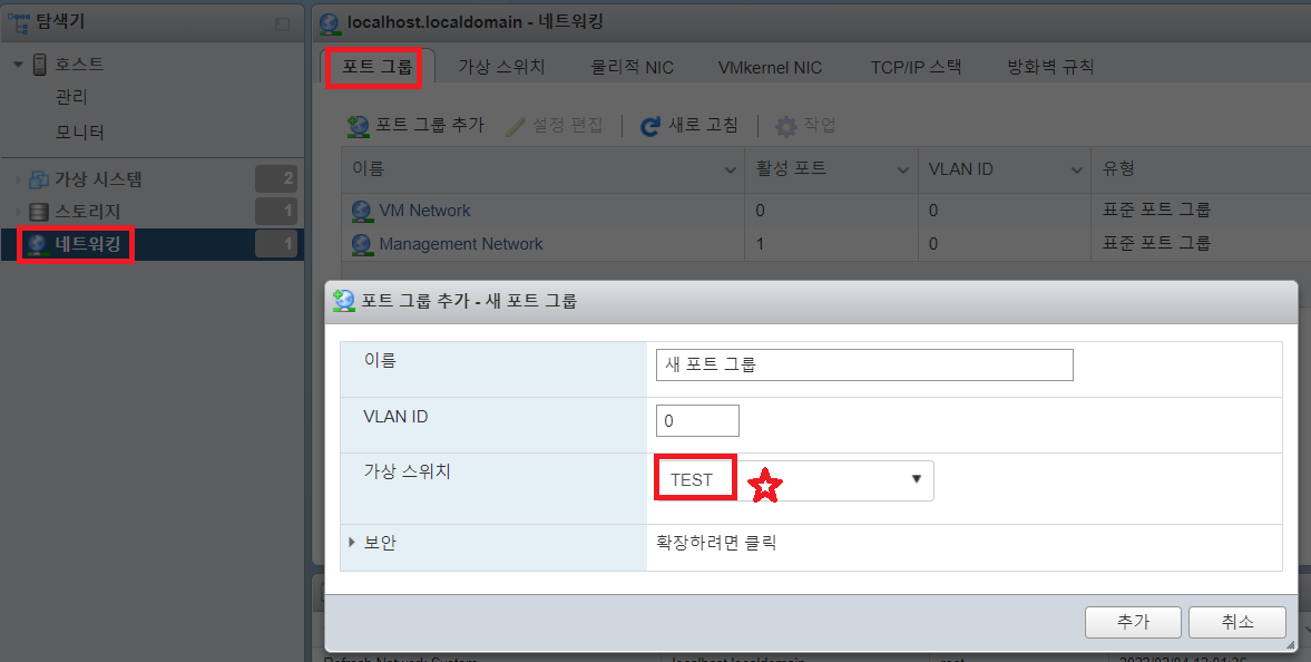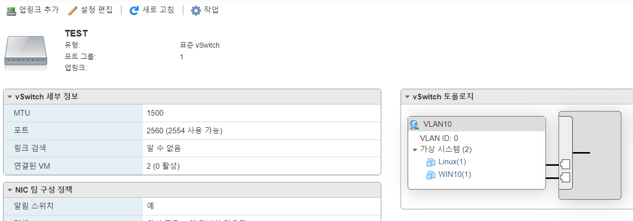 이제 WIN10 과 Linux를 연결하기위한 Switch를 생성하고 각각 연결하기위한 포트를 만들어줘야한다. 이를 포트그룹이라고 한다.