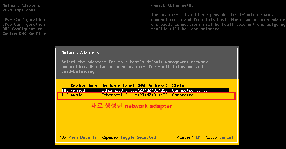 - VMK 0 이란 ESXI 설치시 자동으로 생성되는 ESXI의 Management IP이다. VMK 0 은 자동으로 vSwitch0에 연동된다. vSwitch0에는 물리적인 uplink가 자동으로 연동 된다.