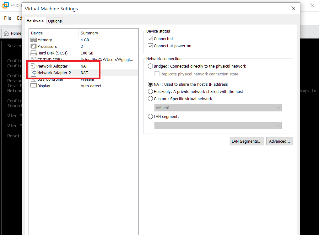 ESXI에 GUI로 접속이 되는 과정에 대해서 이야기를 해보자 ESXI를 만들고 ESXI에 Network 어댑터를 추가해준 후 IP를 설정 한다.
