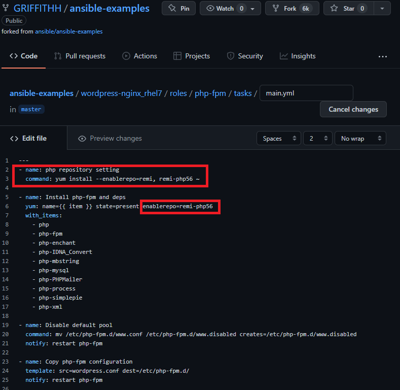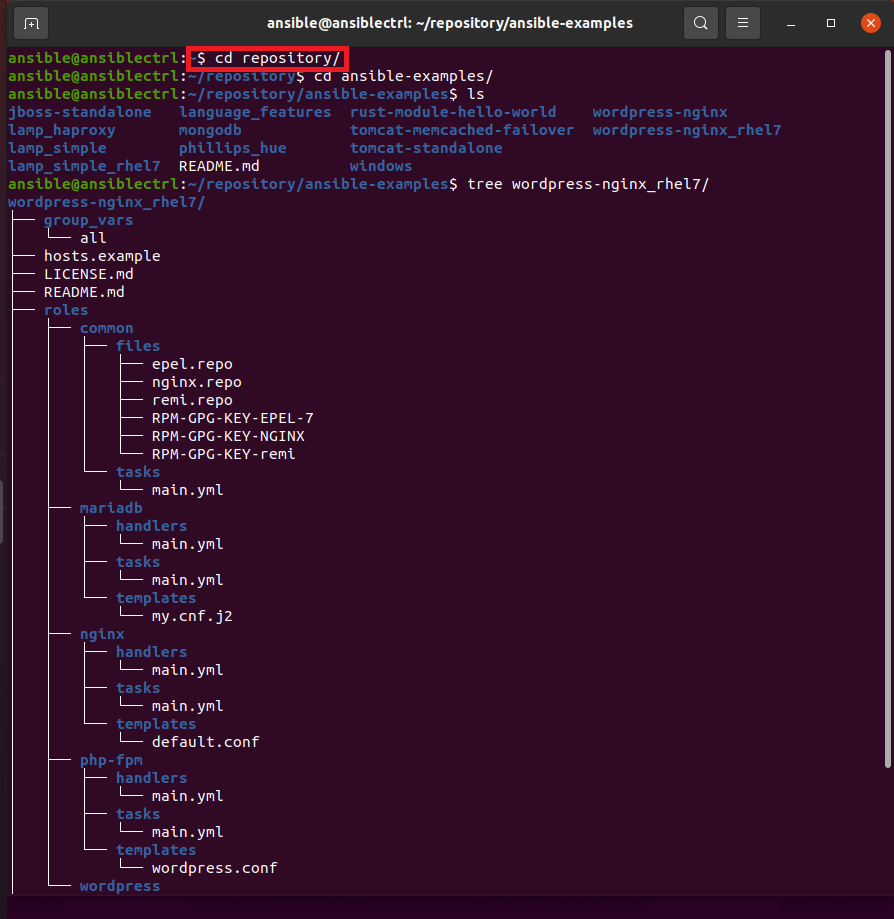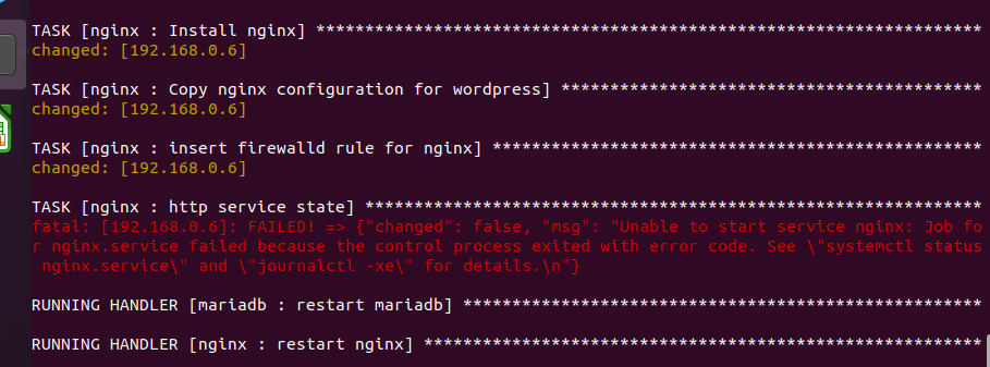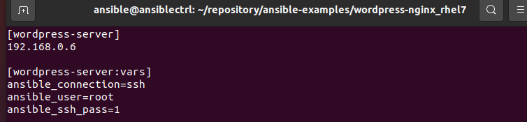 자 이제 playbook을 실행할 환경이 구성되었다. wordpress-nginx_rhel7 폴더에 존재하는 site.yml 플레이북을 실행해보자