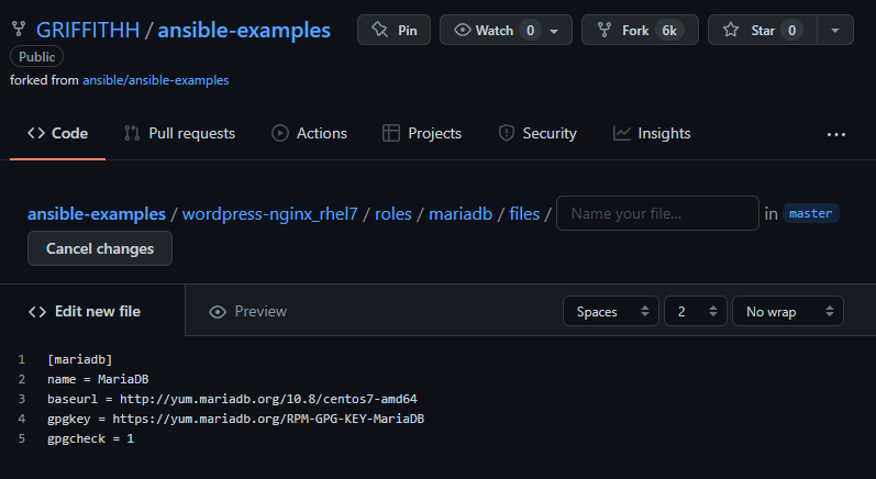 본인은 깃 헙에서 바로 폴더를 생성 후 파일을 만들었다. 파일 이름은 MariaDB.repo ->. repo는 repository파일을 의미