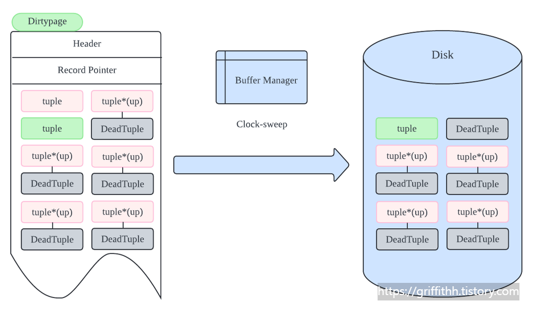 check point로 인한 디스크 쓰기와 알고리즘에 의한 교체는 목적이 다르다. 플러시는 메모리의 수정된 데이터를 디스크로 단순히 저장하는 과정일 뿐, 데이터 구조 자체에는 변화를 주지 않으며 이 과정에서는 죽은 튜플도 여전히 디스크에 기록된다. 디스크에 기록된 페이지의 dead tuple은 vacuum에 의해서 청소가 되지만 memory와 동기화되지는 않는다. 정확히 이야기하자면 동기화는 일어나지만 vacuum 이 실행하는건 아니고 Postgres 자체의 캐시관리 시스템을 인하여 일어나지만 disk의 dead tuple을 제거한다고 무조건 동기화가 되지않고 메모리에는 남을 수 있다. 따라서 vacuum은 메모리와는 직접적으론 무관하며 disk에서 vacuum이 일어나도 버퍼에는 여전히 dead tuple이 존재하여 메모리를 점유 할 수 있다.