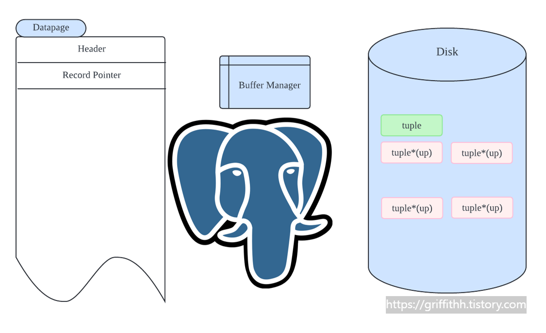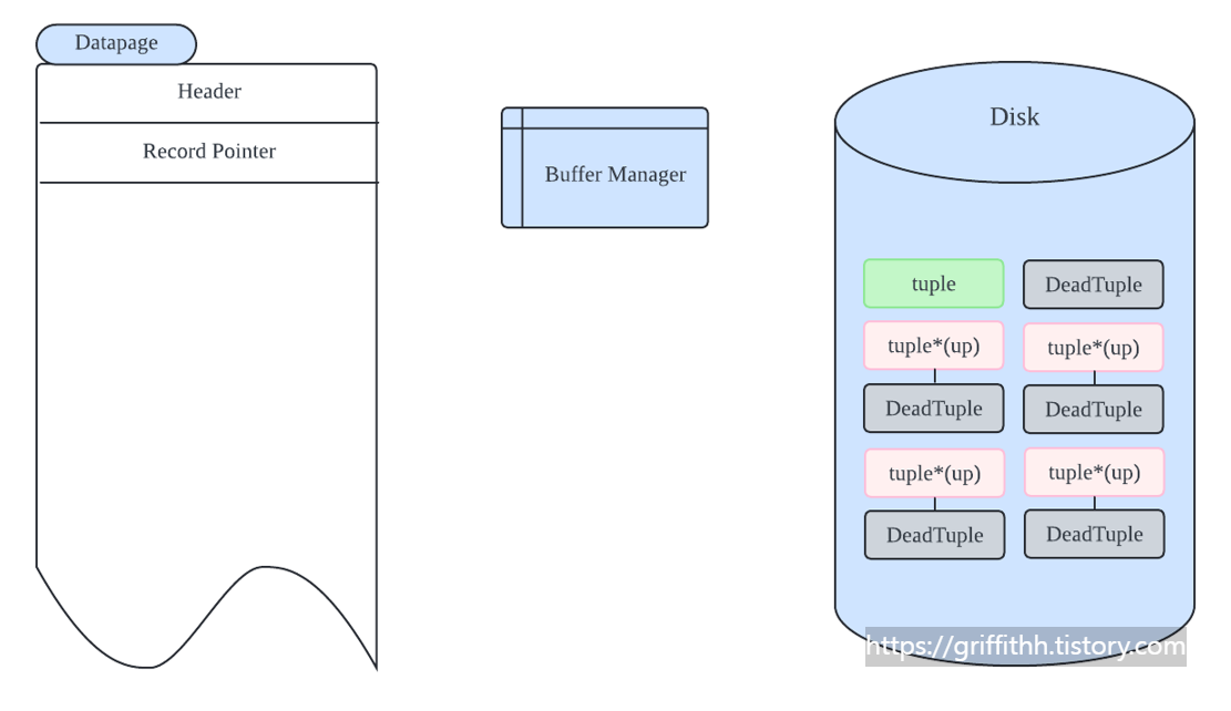 vacuum 은 disk에서 dead tuple 을 정리한다. 이 dead tuple 은 MVCC 동시성 제어를 위하여 생기는데 위 postgres 공식문서에서 확인 할 수 있듯이 UPDATE , DELETE 시에 기존의 tuple을 old version으로 남겨두고 UPDATE 일땐 새로운 tuple , new version , 로 복사한다. DELETE 라면 new version 없이 제거일 것 이다.