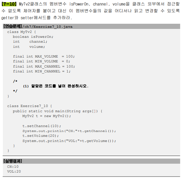 해당 연습문제는 자바의 정석3판 연습문제를 참조했습니다. getter & setter 생성문제다. 아주 간단한 문제지만 , 사용자 입장에서 생각해봤을때 어떤게 추가되어야 할지 생각해봐야한다. class MyTv2{ private boolean isPowerOn; private int channel; private int volume; final int MAX_VOLUME = 100; final int MIN_VOLUME = 0; final int MAX_CHANNEL = 100; final int MIN_CHANNEL = 1; public boolean isPowerOn() { return isPowerOn; } public void setPowerOn(boolean powerOn) { isPowerOn..