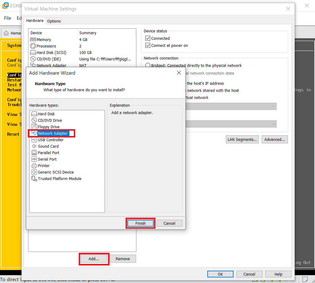 ESXI에 GUI로 접속이 되는 과정에 대해서 이야기를 해보자 ESXI를 만들고 ESXI에 Network 어댑터를 추가해준 후 IP를 설정 한다.